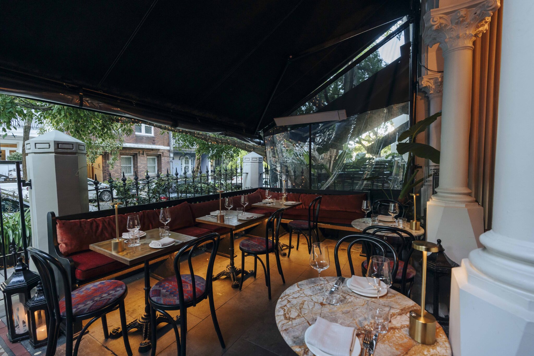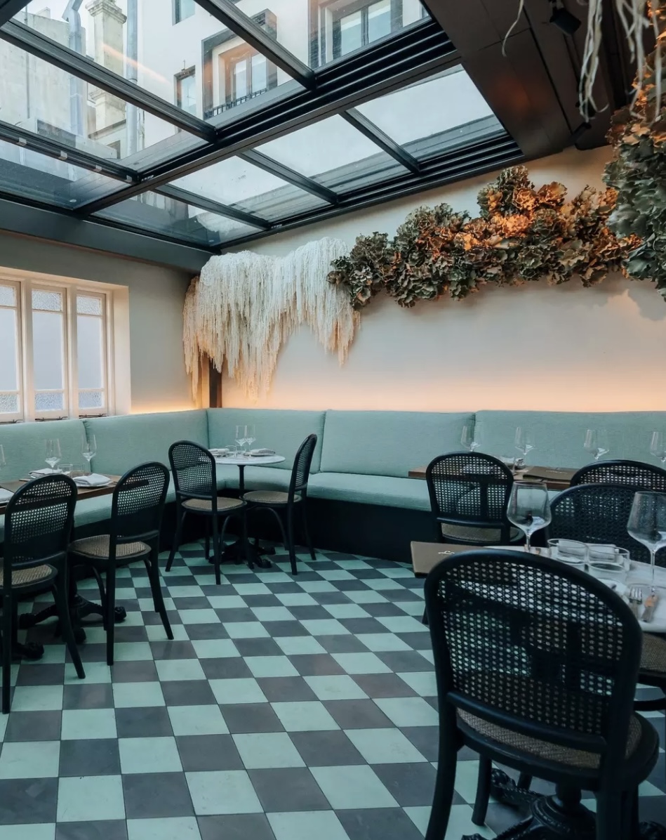 At the rear of the restaurant, large windows and a striking skylight atrium flood the space with natural light, creating a courtyard-style dining area that contrasts with the moody interior and adds a sense of openness to the venue.